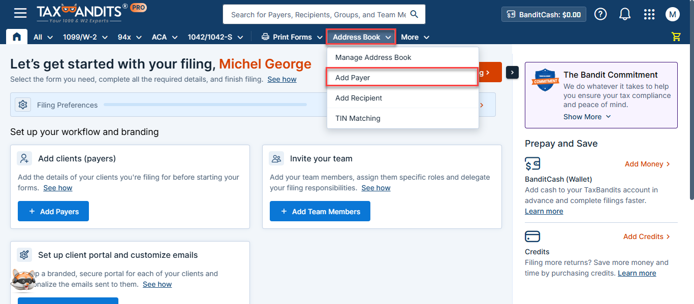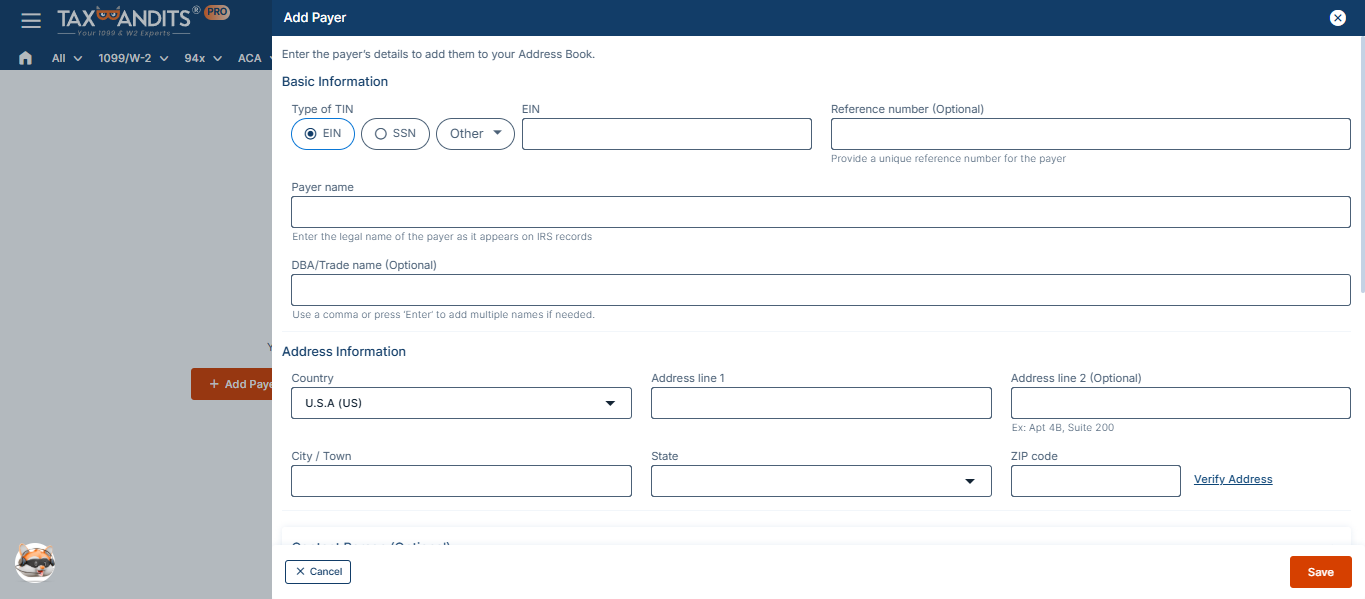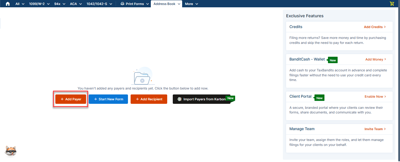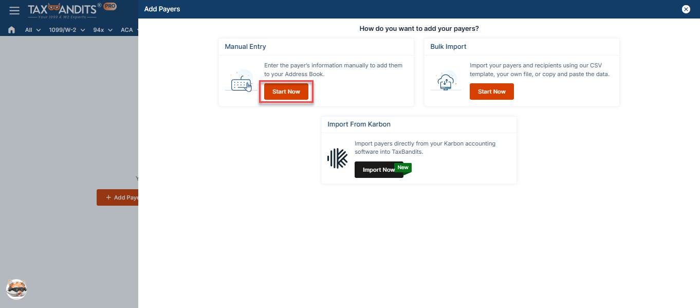 Get Answers Support Getting Started Address Book General How to add new payers in the Address Book? Follow the steps below to add a new payer in the Address Book: Step 1: Sign in to your TaxBandits account. Navigate to the ‘Address Book’ and select ‘Add Payer’ from the drop-down menu. Step 2: Click the ‘Add Payer’ button to add a new business or employer for whom you’re required to file tax forms. Step 3: Select how you’d like to add a new payer. TaxBandits offers the following options: Manual Entry – Choose this option if you want to add the payer by entering their details manually in the required fields. Bulk Import – Recommended when adding multiple payers. We offer a wide range of bulk import options to choose from. See how they work. Import from Karbon – If you have payers in your Karbon account, you can choose this option to import them directly from your Karbon accounting software effortlessly. See how it works. Here, we’ve chosen Manual Entry. Step 4: Enter the basic details of your payer, such as name, EIN or SSN, and other relevant information in the respective fields. Verify that the information is correct and click ‘Save’. Once saved, the payer details will be added to your Address Book, and you can pull their information when filing tax forms. Was this helpful? Yes No Related Questions How to add a recipient/employee to a payer? How do I update/edit payer information in the Address Book? How to reactivate a payer from my Address Book? How to delete a recipient from the Address Book? Go to Home Page Need more help? Get in touch with our dedicated support team Contact Us (704) 684-4751 support@taxbandits.com Sign Up for a FREE TaxBandits Account! The Smart CPA Choice Register Now Already have an account? Sign in