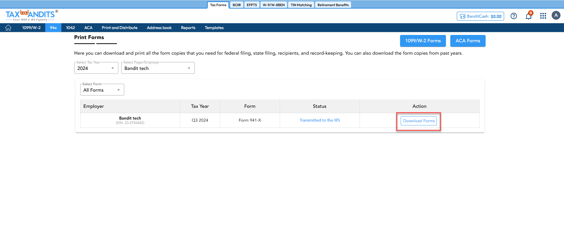 Get Answers Support Tax Filings & Payments 94x Forms Amendments I have prepared my Form 941-X. What should I do next? Once you finish providing all the necessary information in the 941-X form, you need to download, print and mail a paper copy of Form 941-X to the IRS. To do so, follow the steps below: Click the 94x dashboard. From the 94x dashboard, select ‘Amended returns’ and click the ‘Print Forms’ button from the left of the screen to download the completed 941-X forms. Now, click on ‘Download Forms’ to download your 941-X form along with Schedule B and Form 8974. If you are correcting Schedule B (Form 941) or Form 8974. attach them with your Form 941-X, and make sure to mail your Form 941-X on or before the due date to avoid penalties. Note: You must mail Form 941-X to the address provided here to consider filing your return with the IRS. Was this helpful? Yes No Related Questions When should I file Form 941-X? Should I attach the copy of Form 941 along with the 941-X? What Errors on Form 941 can be corrected using Form 941-X? Go to Home Page Need more help? Get in touch with our dedicated support team Contact Us (704) 684-4751 support@taxbandits.com Sign Up for a FREE TaxBandits Account! The Smart CPA Choice Register Now Already have an account? Sign in