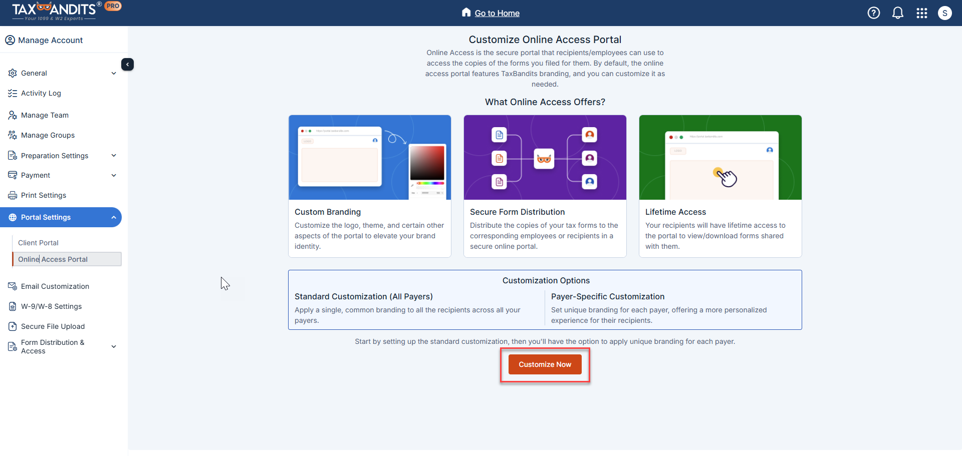 Get Answers Support Tax Filings & Payments Print and Distribute Online Access How to Customize the Recipient Portal of My Business? TaxBandits allows you to customize your recipient portal with your business URL, logo, and theme to reflect your brand. You can choose between our two customization options. Default Customization Default portal customization applies to all recipients across payers. It allows you to personalize the portal with your own branding elements. Payer Specific Customization This option lets you customize the portal exclusively for specific payers, incorporating your brand elements. See how it works Here, we have chosen Default Customization. Choose Template: Select the pre-built template that best suits your needs from the available options. Choose between free or premium templates, then click ‘Continue’. Customize Theme: Customize the color scheme to match your brand. Select your preferred color theme and click ‘Continue’. Customize Name and URL: In the ‘Portal Set-Up’ window, customize the portal name and URL to feature on the secure portal. You can either use the default TaxBandits URL or create a custom URL to suit your business. Once you've completed the customization, click ‘Continue’. Customize Your Logo: Upload your business logo to personalize the secure portal and make it reflect your brand. You can also add a brand message that describes your business. Once complete, click ‘Continue’. Note: If a logo is not provided, the first letter of your business name will be used as a logo. Email Customization: Email Customization allows you to customize the ‘From' email address for emails sent to recipients. Note: You will not receive incoming emails from this email address. Recipients must use the support email address to reach you. Add Support Details: Provide your support email address so clients can contact you with any queries. Finally, click ‘Save and Publish’. Was this helpful? Yes No Related Questions How to enable Online Access for my 1099/W-2 forms? What is Online Access? How do I know if my recipients viewed the 1099/W-2 forms online? Why does my recipient need to grant consent to access recipient copies through online access? Go to Home Page Need more help? Get in touch with our dedicated support team Contact Us (704) 684-4751 support@taxbandits.com Sign Up for a FREE TaxBandits Account! The Smart CPA Choice Register Now Already have an account? Sign in