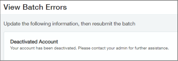 Get Answers Support Tax Filings & Payments Sage Intacct 1099 Filing Getting an error for account deactivation while creating a Batch. How to reactivate my account? When your account is deactivated, then you cannot create a batch and import 1099 data to TaxBandits. You will get the below error message while trying to create a batch. Contact your administrator to reactivate your staff account before pushing the data from Sage. Note: You must once again accept the invitation to push the data into Taxbandits after your account is reactivated. Was this helpful? Yes No Need more help? Get in touch with our dedicated support team Contact Us (704) 684-4751 support@taxbandits.com Sign Up for a FREE TaxBandits Account! The Smart CPA Choice Register Now Already have an account? Sign in