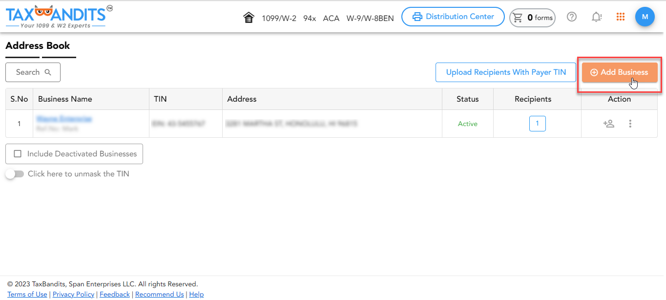 Get Answers Support W-4/W-9/W-8 Form W-9 General How do I add payers to TaxBandits in Bulk? Follow these steps to upload payers to your TaxBandits account in bulk. Step 1: Sign in to your TaxBandits account. Step 2: Click the Grid menu from your dashboard→ Select “Address Book” Step 3: You will be shown the list of Payers/Employers available in your Address Book. Click “Add Business” to enter the new business information. Now you will be shown two options. Manual Data Entry - Allows you to add one Payer/Employer at a time Bulk Upload - Allows you to import multiple Payers/Employers into the Address Book Step 4: Select “Start Now” under the “Bulk Upload”. Step 5: Download the Excel Template, enter the required details, and upload it back to TaxBandits. Step 6: The new business will now be available in your Address Book. You can easily select this payer to file forms for them. Was this helpful? Yes No Need more help? Get in touch with our dedicated support team Contact Us (704) 684-4751 support@taxbandits.com Sign Up for a FREE TaxBandits Account! The Smart CPA Choice Register Now Already have an account? Sign in