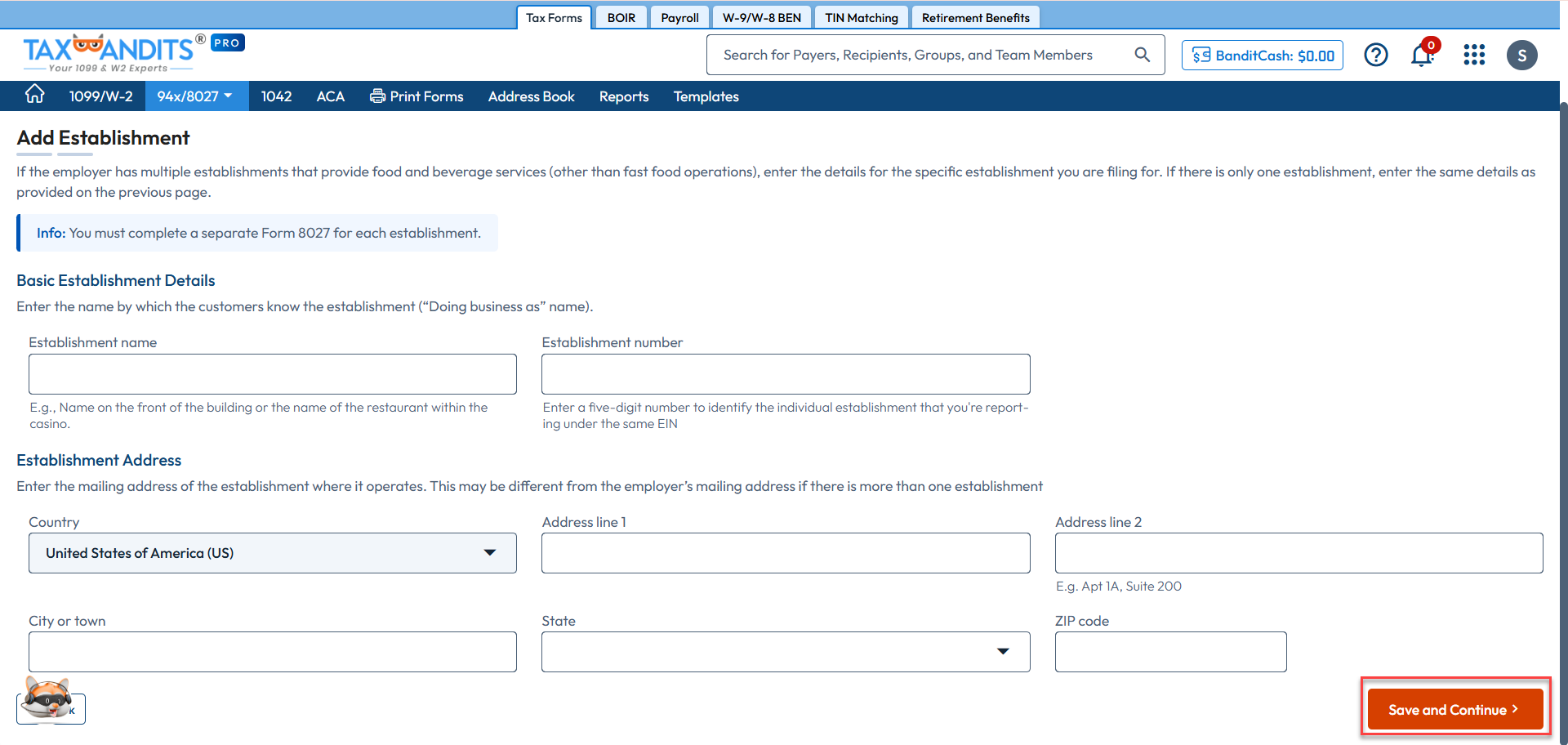Get Answers Support Tax Filings & Payments Other Forms Form 8027 How to file Form 8027 with TaxBandits? To e-file your Form 8027 with TaxBandits, follow these steps for a hassle-free filing experience: Step 1: Sign in to your TaxBandits account. Step 2: Click 'Start New Form' and select 'Form 8027.' Step 3: Click on 'Select Employer From Address Book' to add the employer details from the address book or you can also add the details manually. Step 4: Enter the establishment details in the respective fields and click ‘Save and Continue.’ Step 5: Enter the required details in the respective fields, your employer and establishment details will be automatically mapped to the form. Step 6: You can review the summary of forms that are ready for filing. You also have an option to download the draft version of the form in PDF format. Step 7: Proceed to payment and transmit the form. After transmission, track the status of your return in the 94x/8027 dashboard. Was this helpful? Yes No Related Questions What is Form 8027? How long does it take for the IRS to process my 8027 forms? What is the 10 Employee test? I have already filed my W-2s for the year without tip allocations. What should I do? Go to Home Page Need more help? Get in touch with our dedicated support team Contact Us (704) 684-4751 support@taxbandits.com Sign Up for a FREE TaxBandits Account! The Smart CPA Choice Register Now Already have an account? Sign in