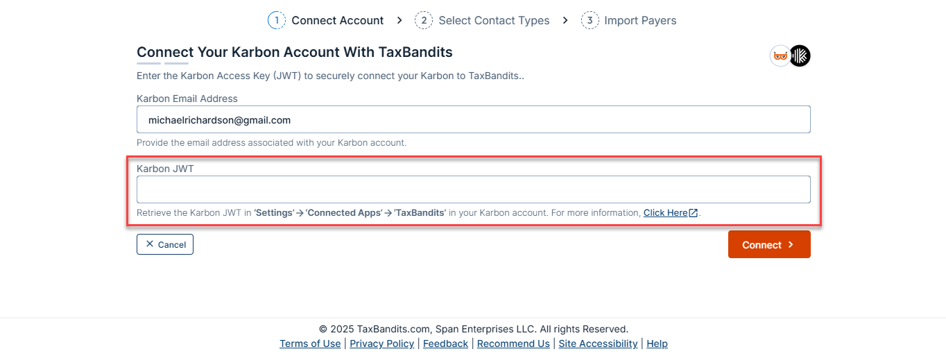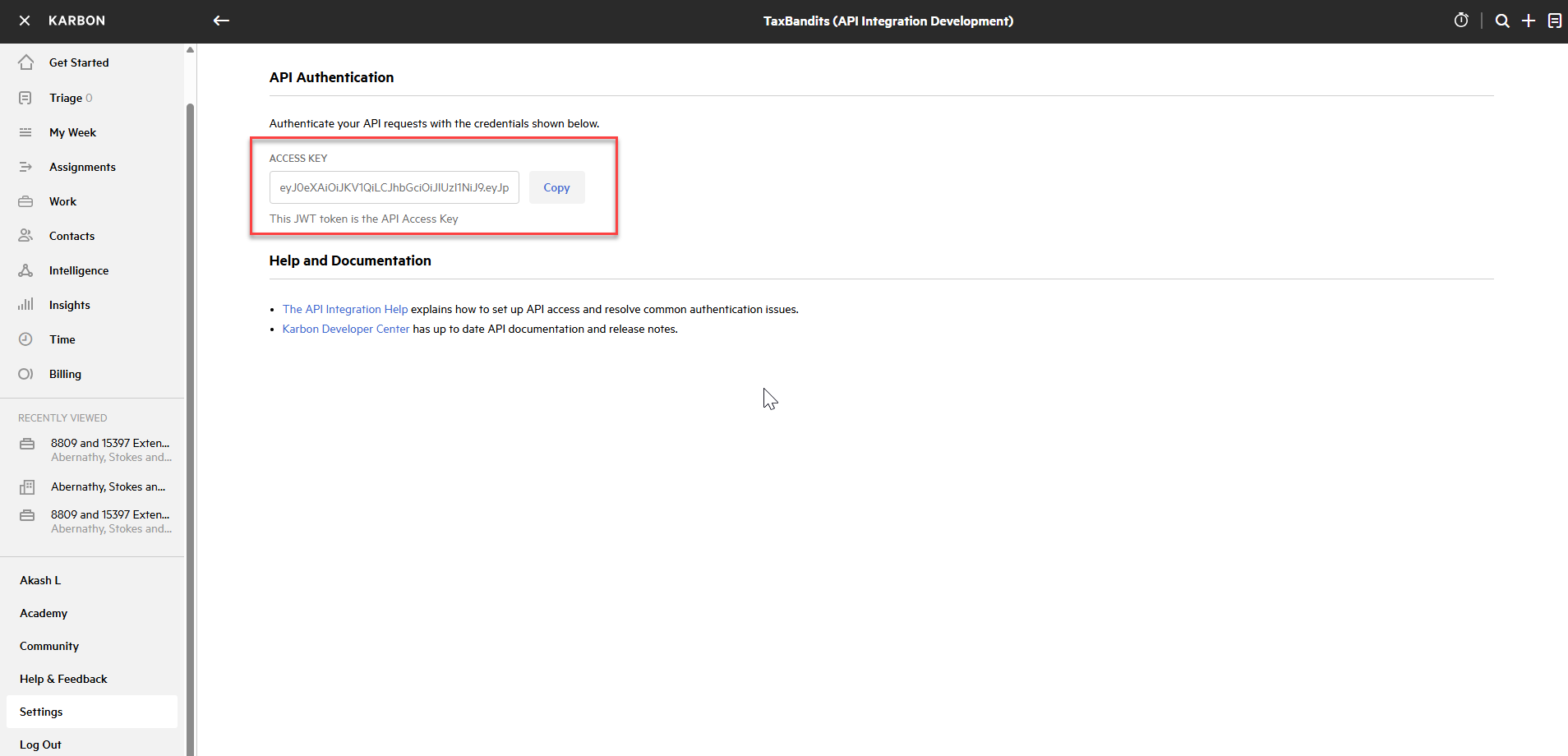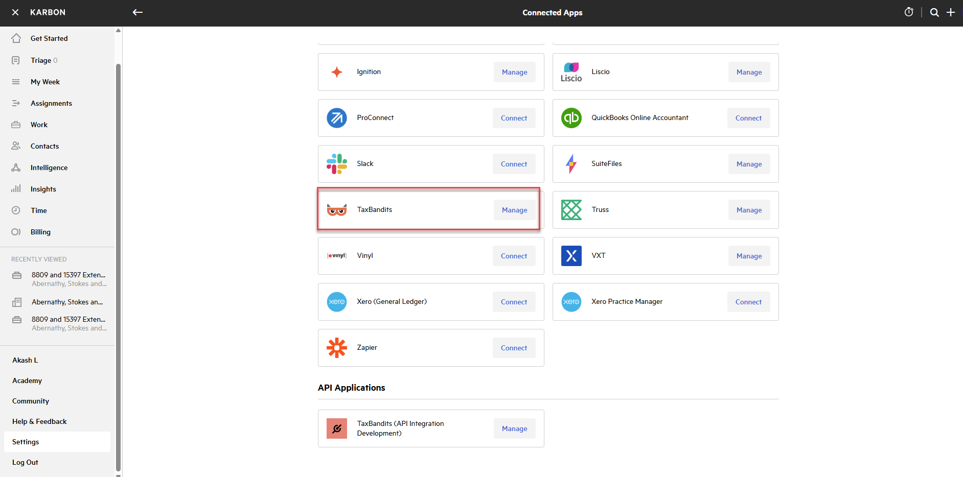 Get Answers Support Tax Filings & Payments Data Import Karbon Where can I find my Karbon Access Key (JWT)? To connect your Karbon account with TaxBandits, you’ll need to enter the email address linked to your Karbon account along with your Karbon access key (JWT). Follow the steps to find your Karbon JWT: Step 1: Log in to your Karbon account. Step 2: Go to ‘Settings’ from the sidebar and select ‘Connected Apps’. Step 3: Find ‘TaxBandits’ in the list and click 'Manage' to view your Karbon access key (JWT). Once you have the key, enter it to securely connect Karbon with TaxBandits. For more information, visit Karbon Help Center. Was this helpful? Yes No Related Questions How does the Karbon integration work with TaxBandits? If I disconnect my Karbon account, will the data in my TaxBandits Address Book be lost? How to reconnect my Karbon account with TaxBandits? Go to Home Page Need more help? Get in touch with our dedicated support team Contact Us (704) 684-4751 support@taxbandits.com Sign Up for a FREE TaxBandits Account! The Smart CPA Choice Register Now Already have an account? Sign in