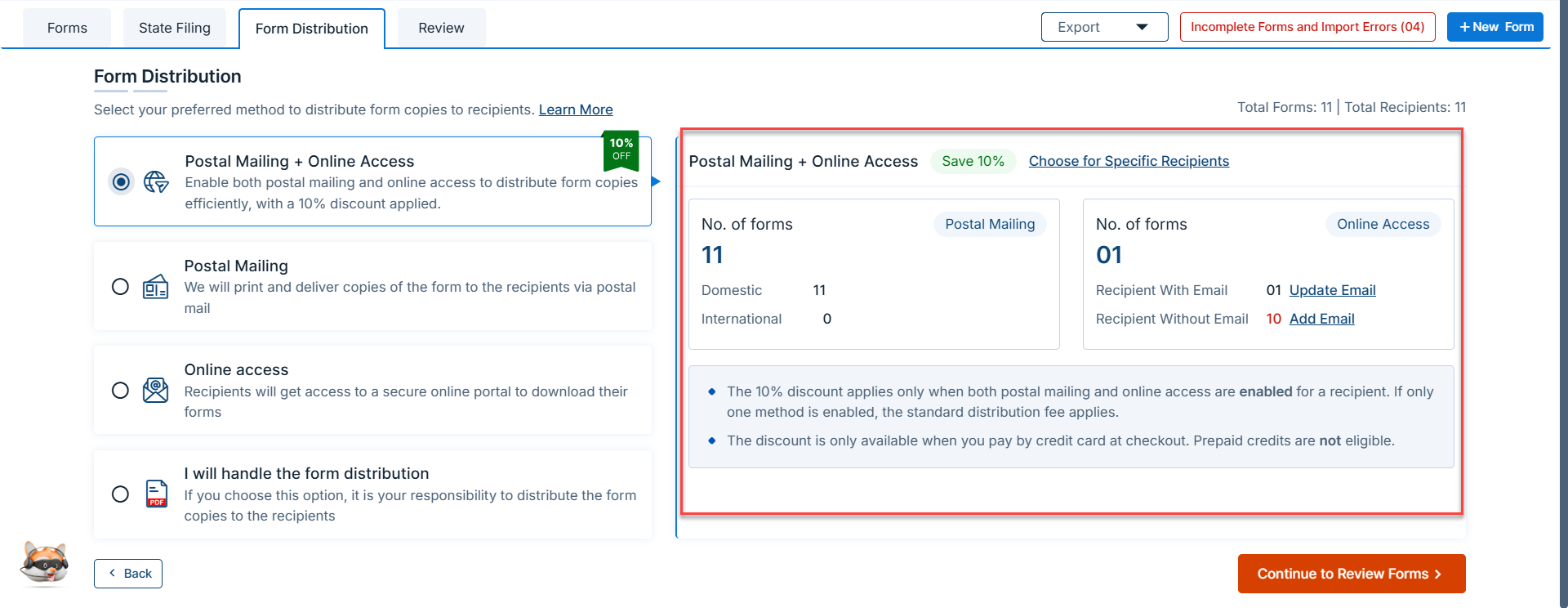 Get Answers Support Tax Filings & Payments Print and Distribute General What is Postal Mailing + Online Access? TaxBandits offers a Postal Mailing + Online Access service that combines the speed of secure online delivery with the assurance of physical mailing. Recipient copies of tax forms are sent both by mail and made available online, ensuring every recipient gets their forms in the way that works best for them. When you enable this option, you’ll also receive a 10% discount on the distribution fee (available only when payment is made by credit card at checkout; prepaid credits are not eligible). How does it work? Postal Mailing – Forms are mailed once they are transmitted to the federal and/or state agencies. If forms are scheduled for a later transmission date, mailing will take place on that date. It typically takes up to 1–2 business days to process the mailing. You can track mailing status anytime from your 1099/W-2 Dashboard → Submitted tab. Understand mailing timeframes Online Access – Immediately after the order is placed, recipients are granted lifetime access to view and download their forms through a secure online portal. Advanced Distribution – You have the flexibility to enable dual distribution for all recipients or select only specific recipients as needed. Was this helpful? Yes No Related Questions What is Online Access? What is Smart Mail, and how does it work? How to enable Smart Mail in TaxBandits? What is Advanced Distribution? Go to Home Page Need more help? Get in touch with our dedicated support team Contact Us (704) 684-4751 support@taxbandits.com Sign Up for a FREE TaxBandits Account! The Smart CPA Choice Register Now Already have an account? Sign in